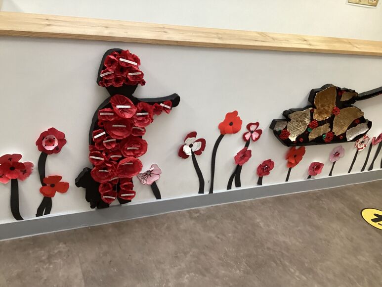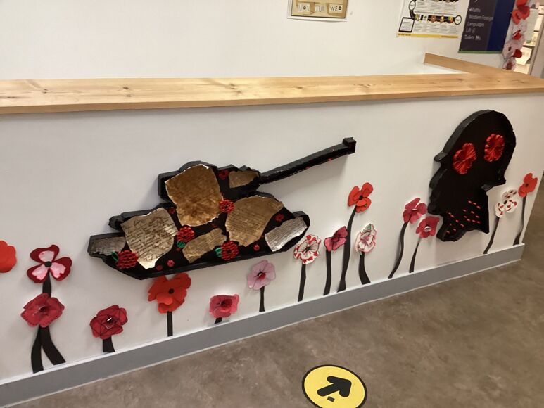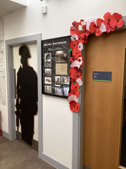 At the end of the Autumn term, Miss Hoskins, Miss Constaninou and her Year 10 art class set about creating a larger installation. By painting a large mural and silhouette figures, alongside the texture scattered poppies, creates a beautiful place for a moment of thought and Remembrance.